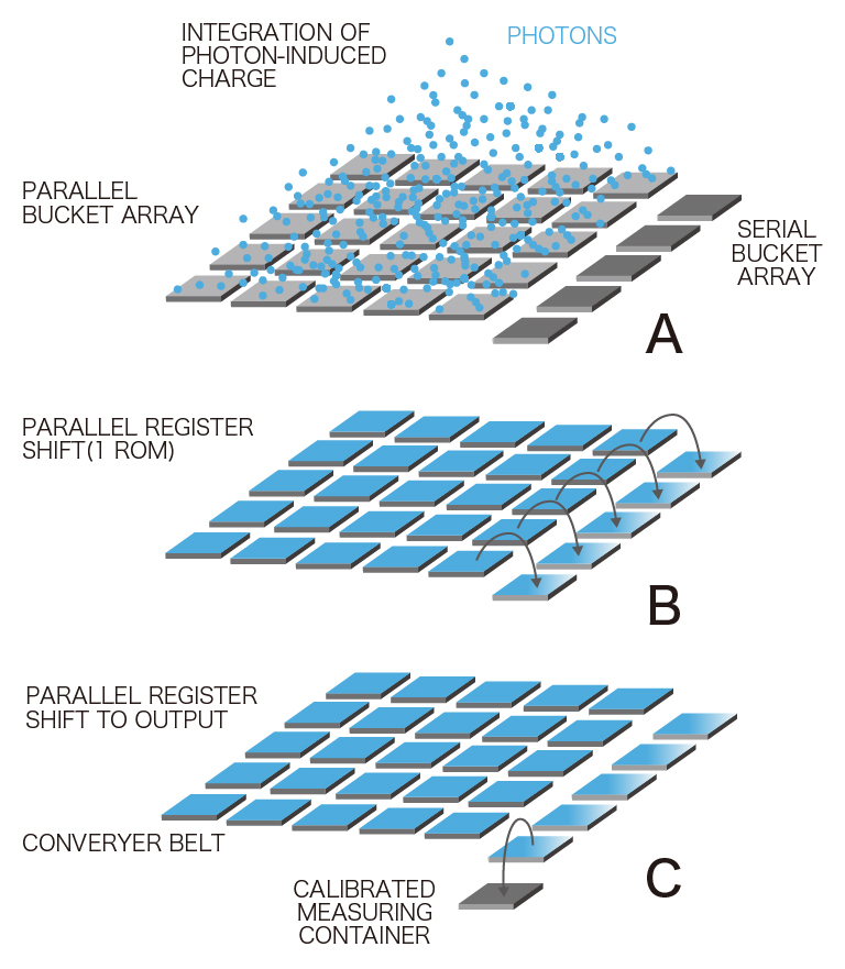 Photoelectrons accumulate in each bucket until it’s time for readout, when all of the photoelectrons are relayed from one bucket to the next down each row of pixels.