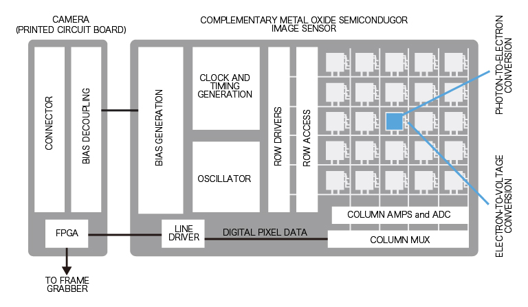 Unlike a CCD sensor, photoelectrons are converted into voltage by each pixel’s photodiode-amplifier pair.