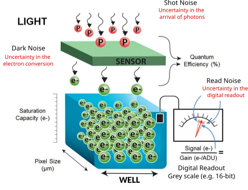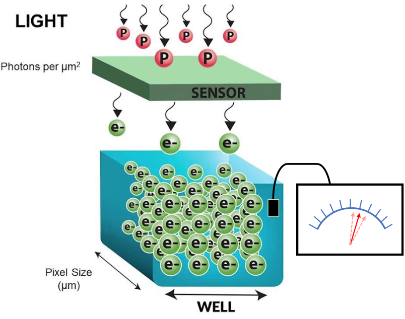 Each pixel of the CCD image sensor is composed of a photodiode and a potential well, which can be thought of as a bucket for photoelectrons.