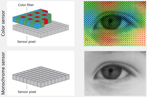 Each pixel captures the full intensity of incoming light, resulting in higher sensitivity and better signal-to-noise ratio (SNR) compared to color cameras.