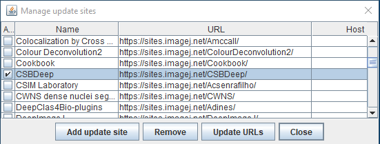 Step 4: Scroll down the list and tick the checkboxes for update sites: CSBDeep (shown below), StarDist and TrackMate-StarDist, then click the Close button.
