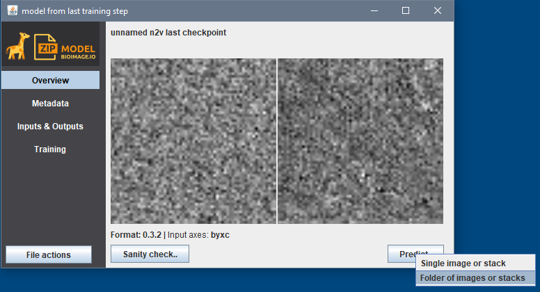 N2V train + predictwindow. Choose the following options and click OK.- Axes of prediction input: XYZ