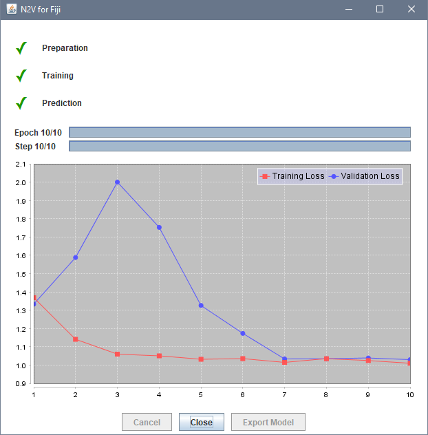 A window showing the progress of different steps (Preparation, Training and Prediction) will open. As the training progresses, training loss (red) and validation loss (blue) curves are displayed in the window (see below). If training goes well, then both the red and blue curves will decrease with more cycles (epochs) of training and stabilize around a minimum loss value (~ 1.0 in the image below). Training loss goes down from the beginning but Validation loss (blue curve) usually goes up in the beginning and then comes down and approaches the red curve.
