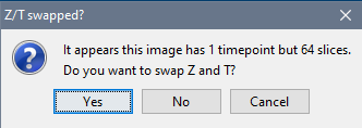 TrackMateplugin, just like in Exercise 2.Since this is a Z-stack and TrackMate works on a time-lapse sequence, we need to swap Z and T dimensions. TrackMate automatically detects it and asks for dimension swapping. Click